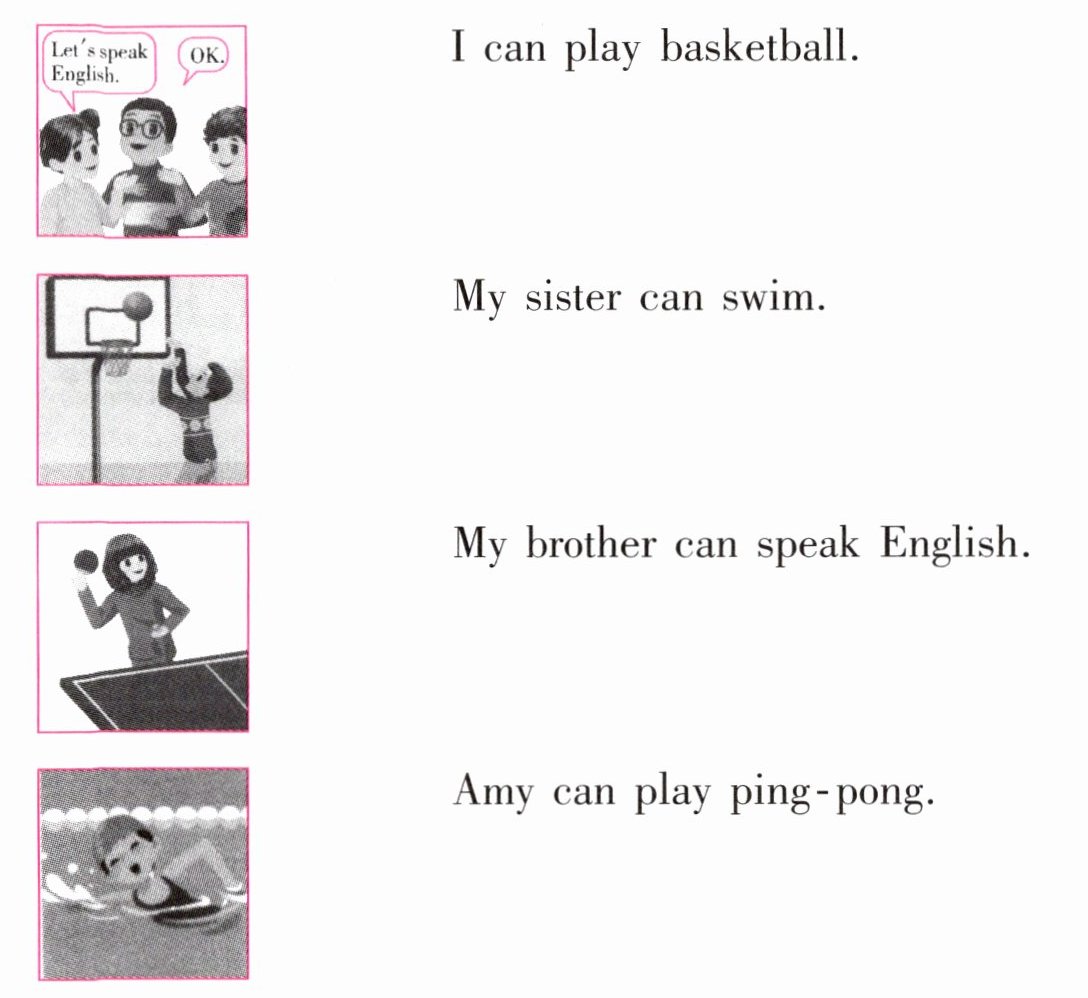 Hello! My name is Linda. Look! These are my new friends: Chen Jie, Zhang Peng, Mary and Jack. We are all helpful. I can draw cartoons. Chen Jie can play the pipa. Zhang Peng can sing English songs. Mary can play the piano. Jack can swim and do some kung fu!