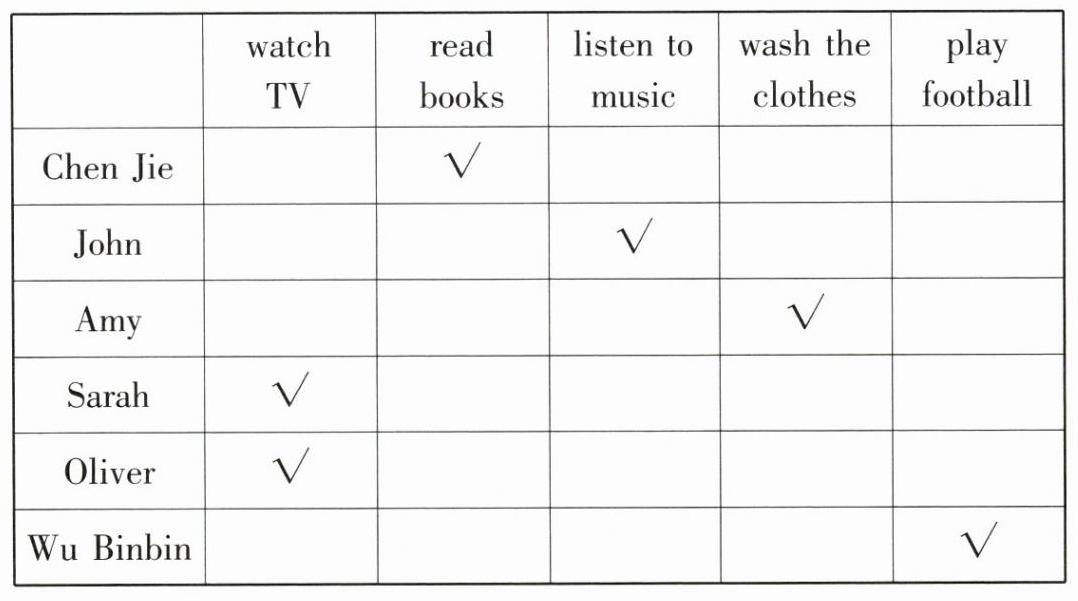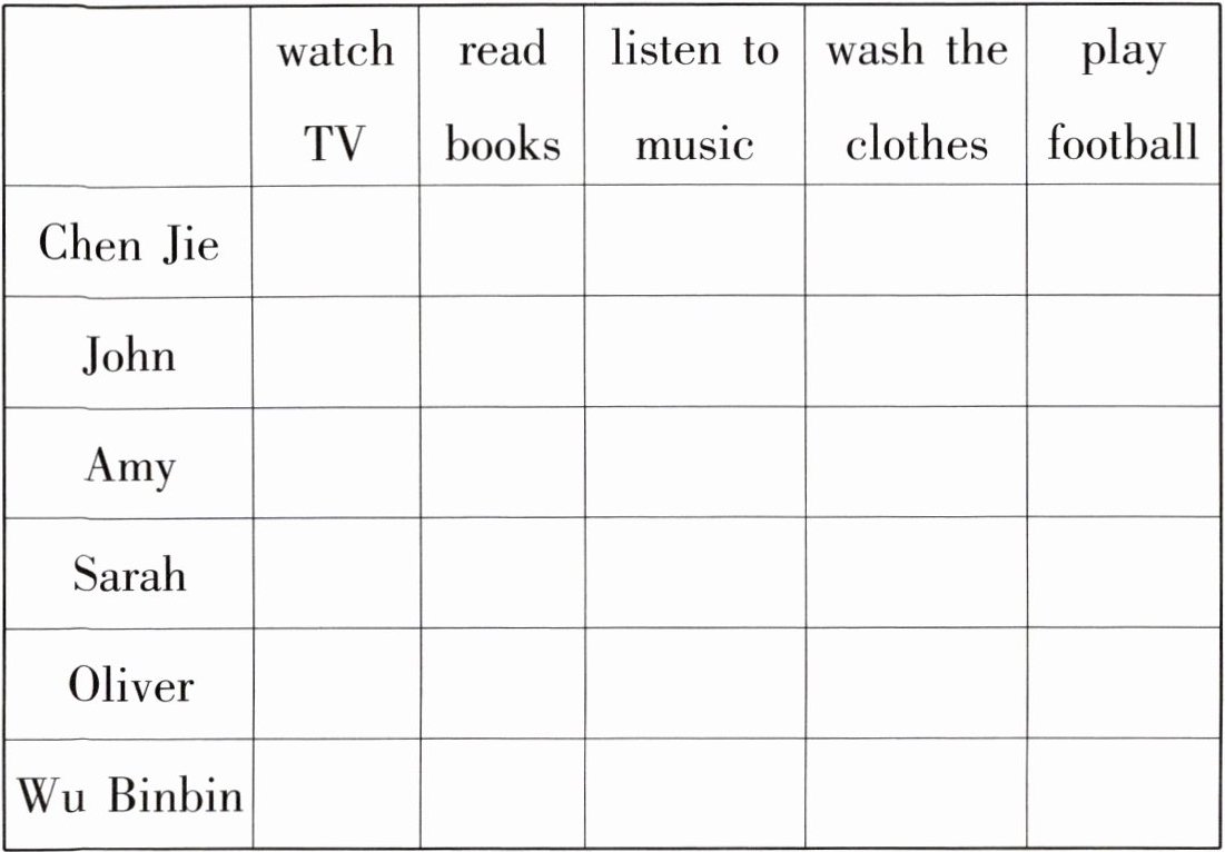 | | watch TV | read books | listen to music | wash the clothes | play football |