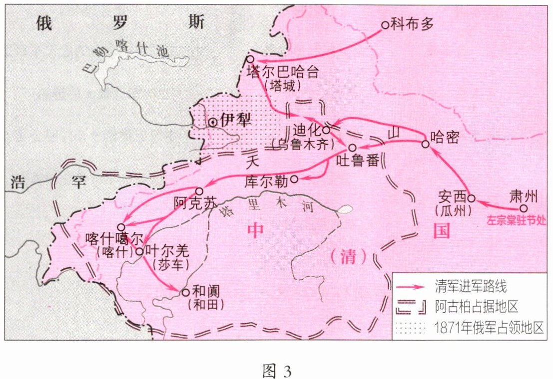 4.(1)洋务派的一些革新措施为清军收复新疆奠定了(军事)基础。(言之有理即可)(2)以军事角度为例:创办近代军事工业,培养军事人才,建成新式海军,中国近代军事工业有了一定程度的发展,军队的武器和战术逐渐发生变化。(言之有理即可)