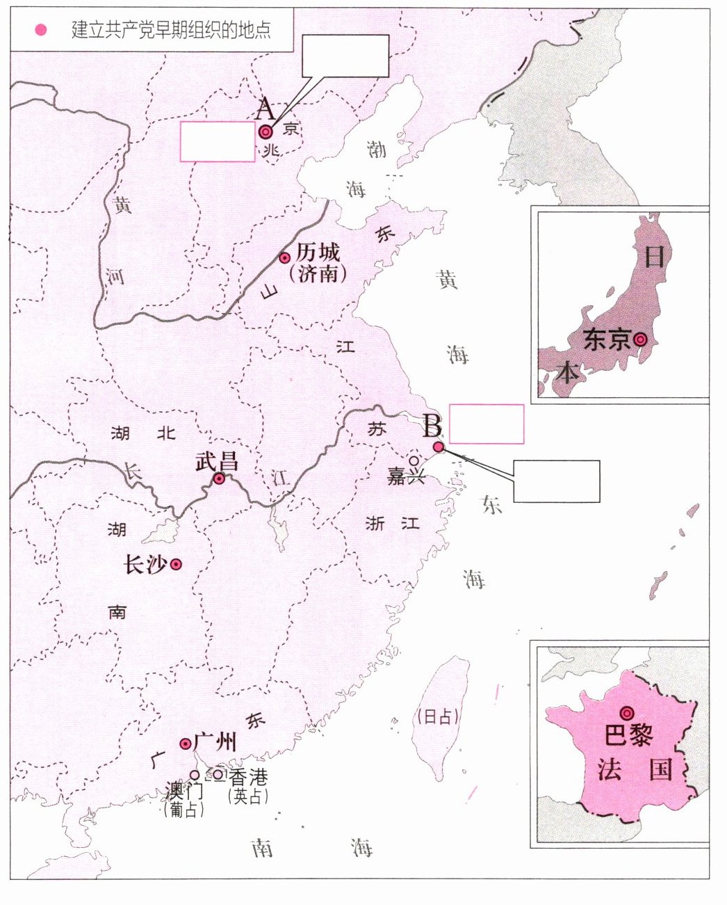 城市建立。此外,A、B两地也有共产党早期组织,将相关地名填写在红框内。(2) 用红笔在图中圈画出中共一大的召开地。