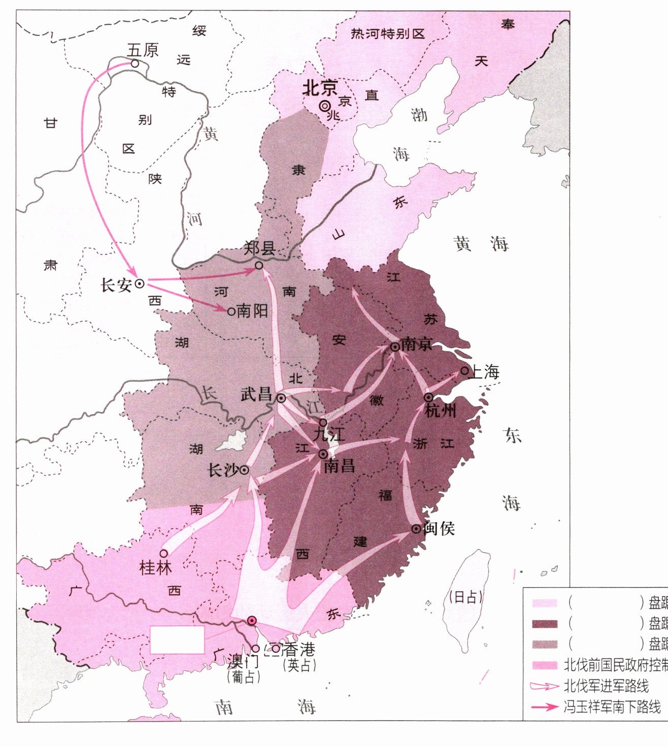 两省境内,在图中圈画省名。(4) 在图中描画北伐进军路线。由此可以看出,北伐军的进攻方向是