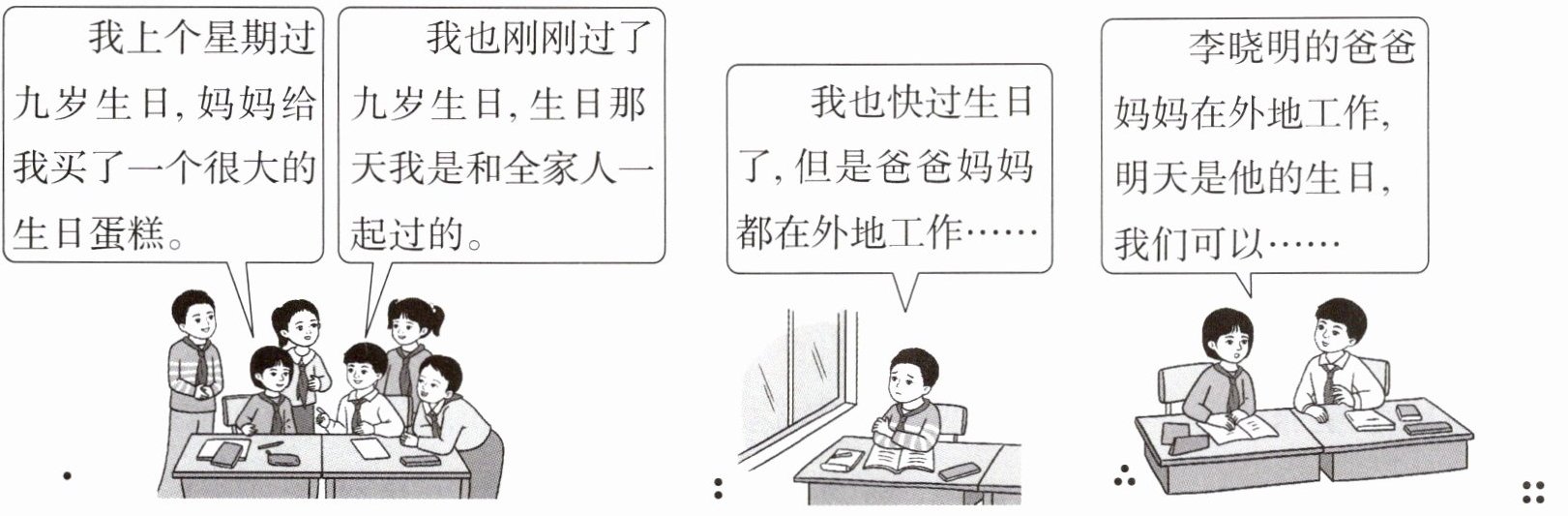 。3. 第三幅图:其他同学知道了李晓明的爸爸妈妈在外地工作,打算