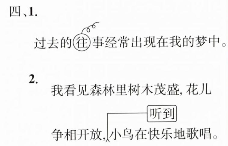 2. 我看见森林里树木茂盛,花儿争相开放,小鸟在快乐地歌唱。