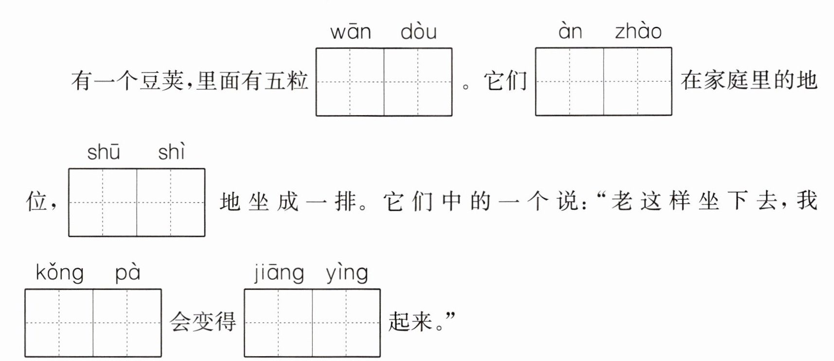 (1)“现在我要飞到广阔的世界里去了!如果你能捉住我,就请来吧!”第一粒豌豆说完就飞走了。(