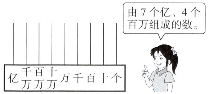 画图:在“亿”对应的竖线上画7个珠子,在“百万”对应的竖线上画4个珠子。