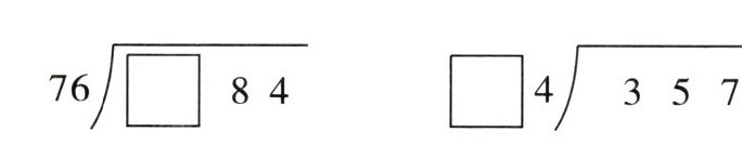 $\begin{array}{r}76\enclose{longdiv}{□84}\end{array} $ $\begin{array}{r}□4\enclose{longdiv}{357}\end{array} $