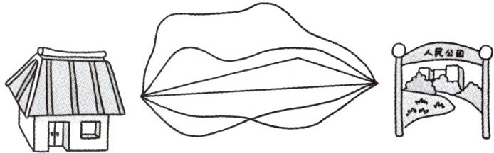 中间直接连接家和人民公园的线段所示的道路最近。(用红笔沿中间图形底部线条画即可,即两点之间的直线段)