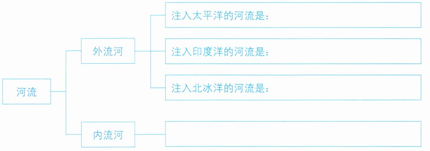 2. 将下列代表河流的数字填在上图中相应圆圈内,并分类填入下图的方框内。