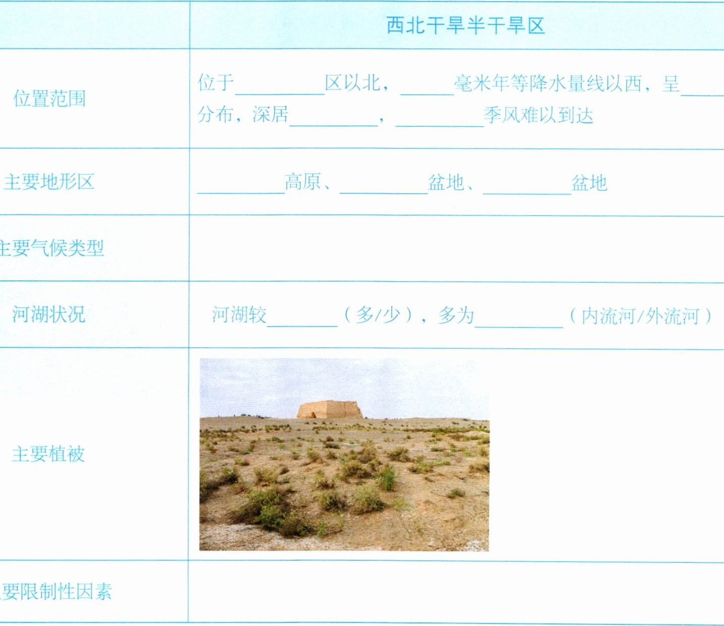 (从上至下)青藏高寒 400 弧形 内陆 夏 内蒙古 塔里木 准噶尔 温带大陆性气候、温带季风气候、高原山地气候 少 内流河 荒漠、草原 水资源
