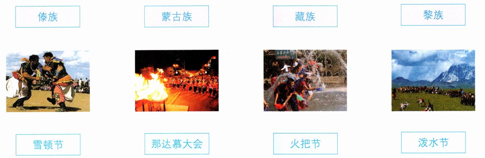 1. 将少数民族节日场景与相应的民族、节日名称连线。