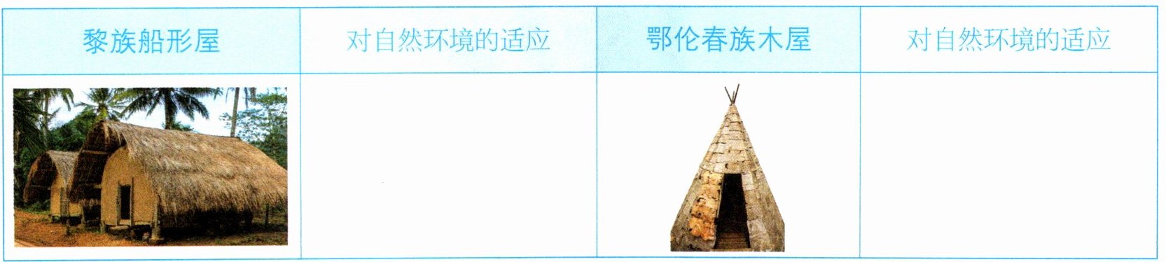 2. 比较海南黎族传统民居、东北鄂伦春族木屋的屋顶结构特征与自然环境的关系,填写下表。