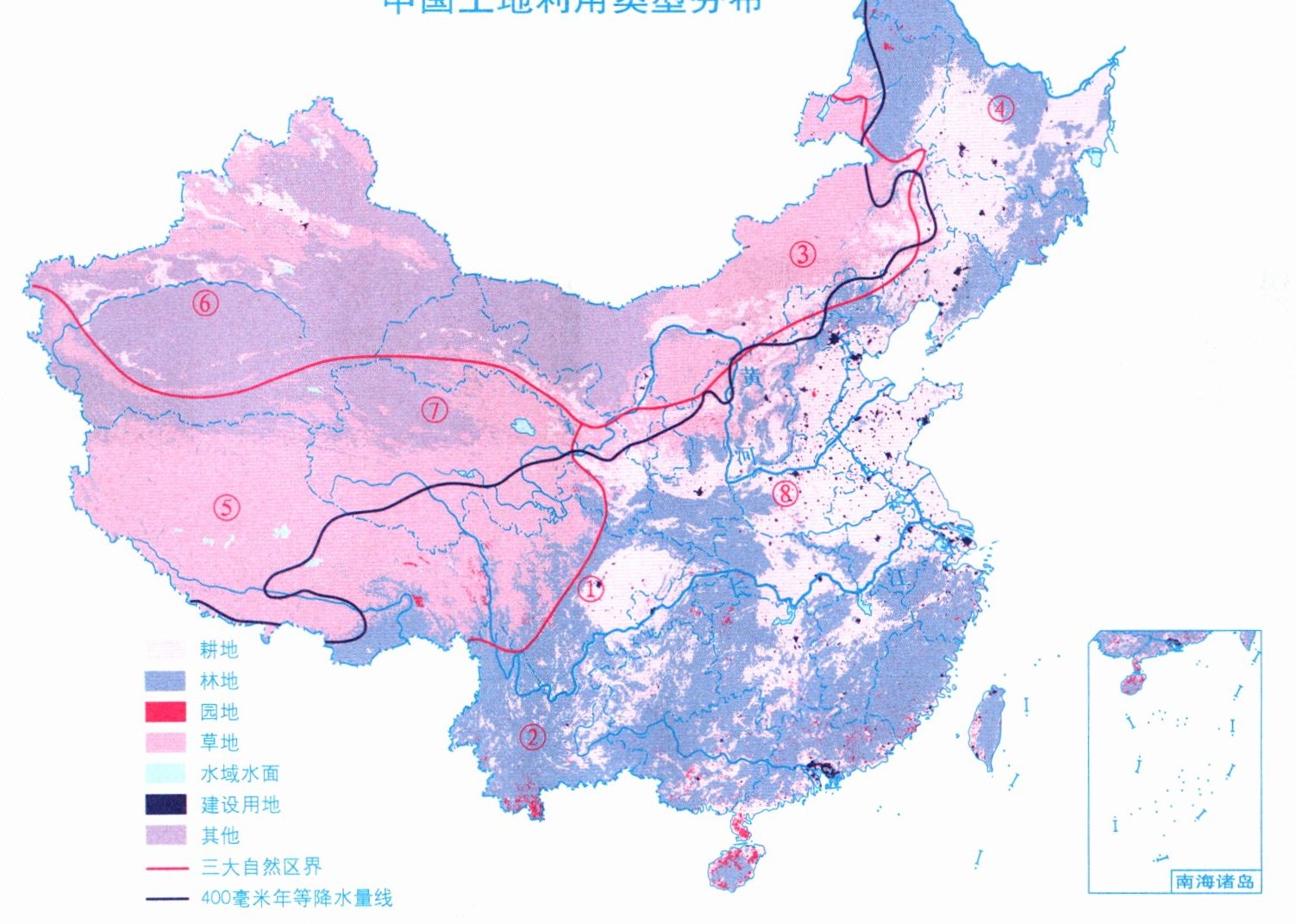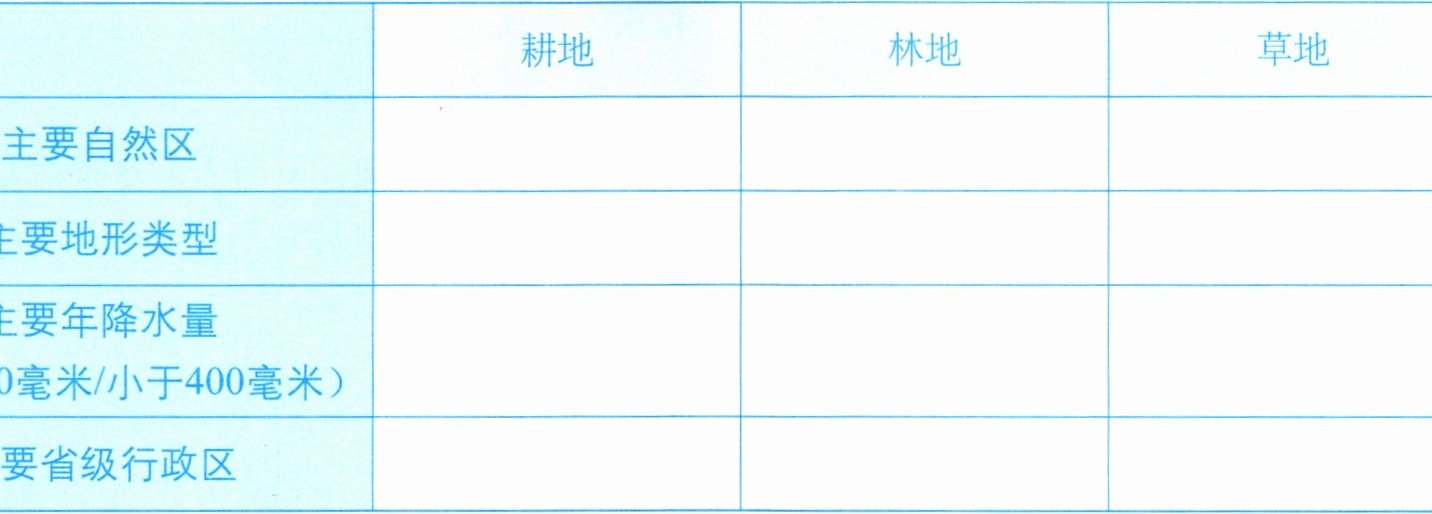 2. 读图,比较下表中三种农用地的分布特点,填写下表;并分析图中数字代表的省级行政区在三种农用地中比重最大的类型,将数字填在表中相应位置。