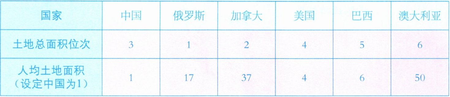 1. 读表可知,中国土地面积居世界第______位,但人均土地面积是美国的______,俄罗斯的______,不足世界平均水平的______%。