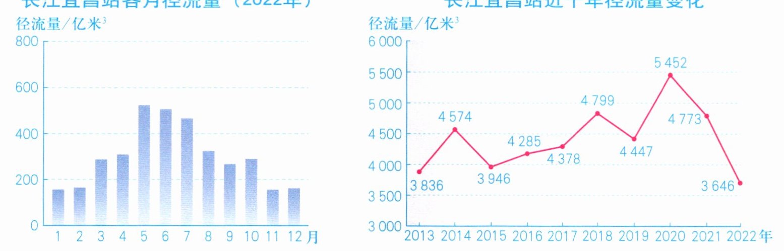 6. 长江宜昌站2020年径流量为_________亿米$^3,2022$年为_________亿米$^3,$两年相差_________亿米$^3,$年径流量的年际变化_________。
