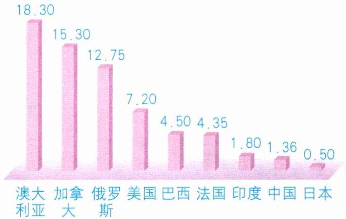 2. 读右图可知,中国人均耕地面积约______亩,不到世界平均水平的______;美国人均耕地面积是中国的______倍,印度人均耕地面积是中国的______倍。