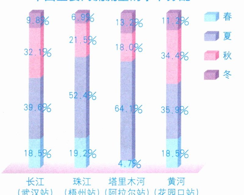 5. 读左图,中国的水资源从时间分配来看,与降水的季节变化一致,______两季多,______两季少。塔里木河位于非季风区,因夏季______,所以河流流量较大,水资源丰富。