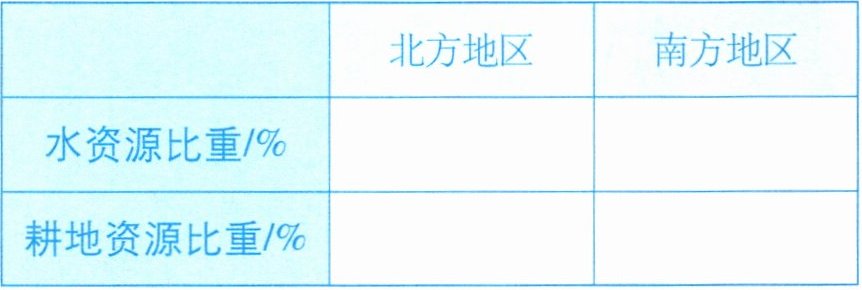 2. 由上表可知,中国的水资源______多______少,耕地资源______多______少。