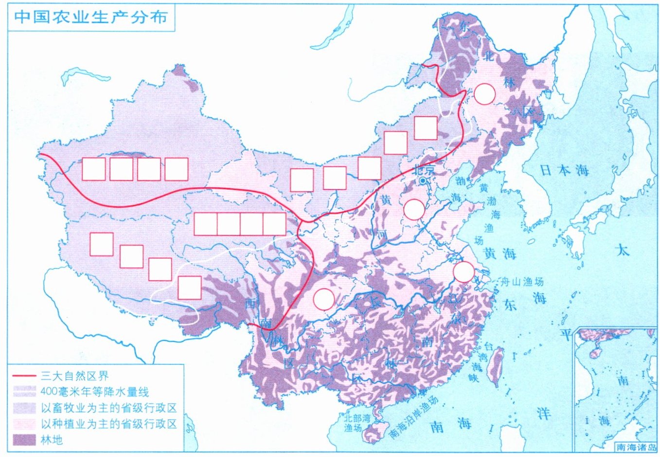 1.描图略 辽阔 400 差异 2.种植 种植 林 渔 3.东北 华北 长江中下游 四川 4.东北 西南 东南 沿海 5.西北干旱半干旱 青藏高寒