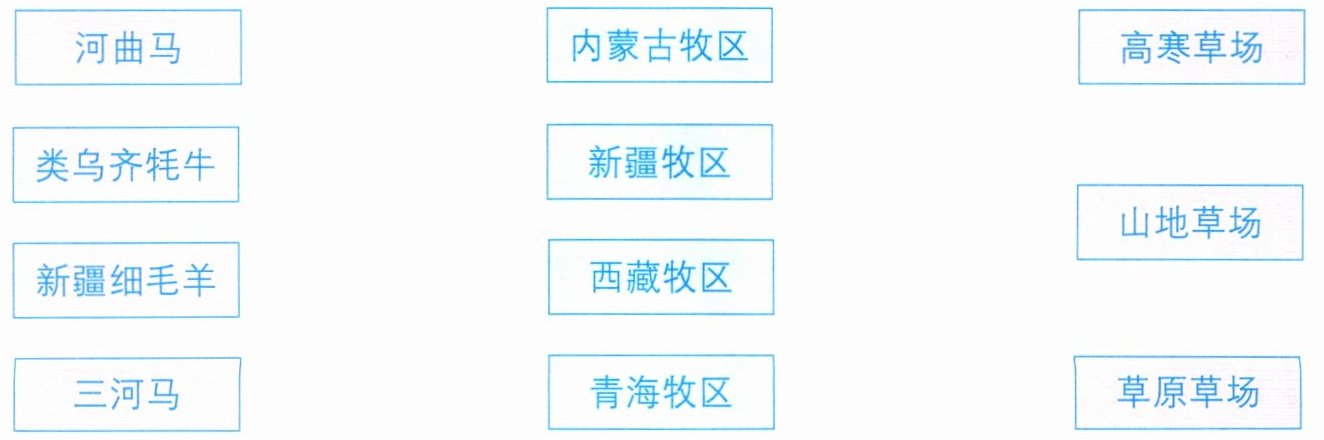 5. 中国三大自然区中的______区和______区以畜牧业为主。在图中相应位置填注四大牧区的名称,并查阅地理图册,将它们与相应的畜产品、主要草场类型连线。