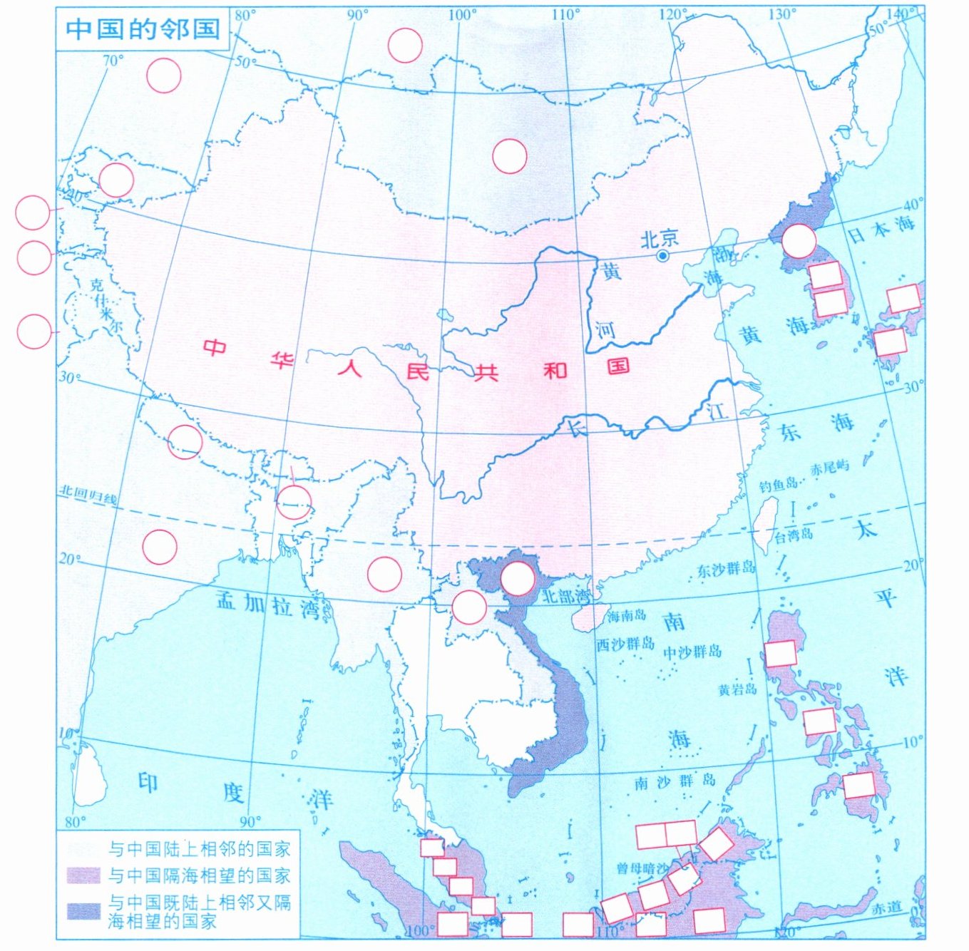 1. 按方位将表中代表中国陆上邻国的数字填在图中相应圆圈内。