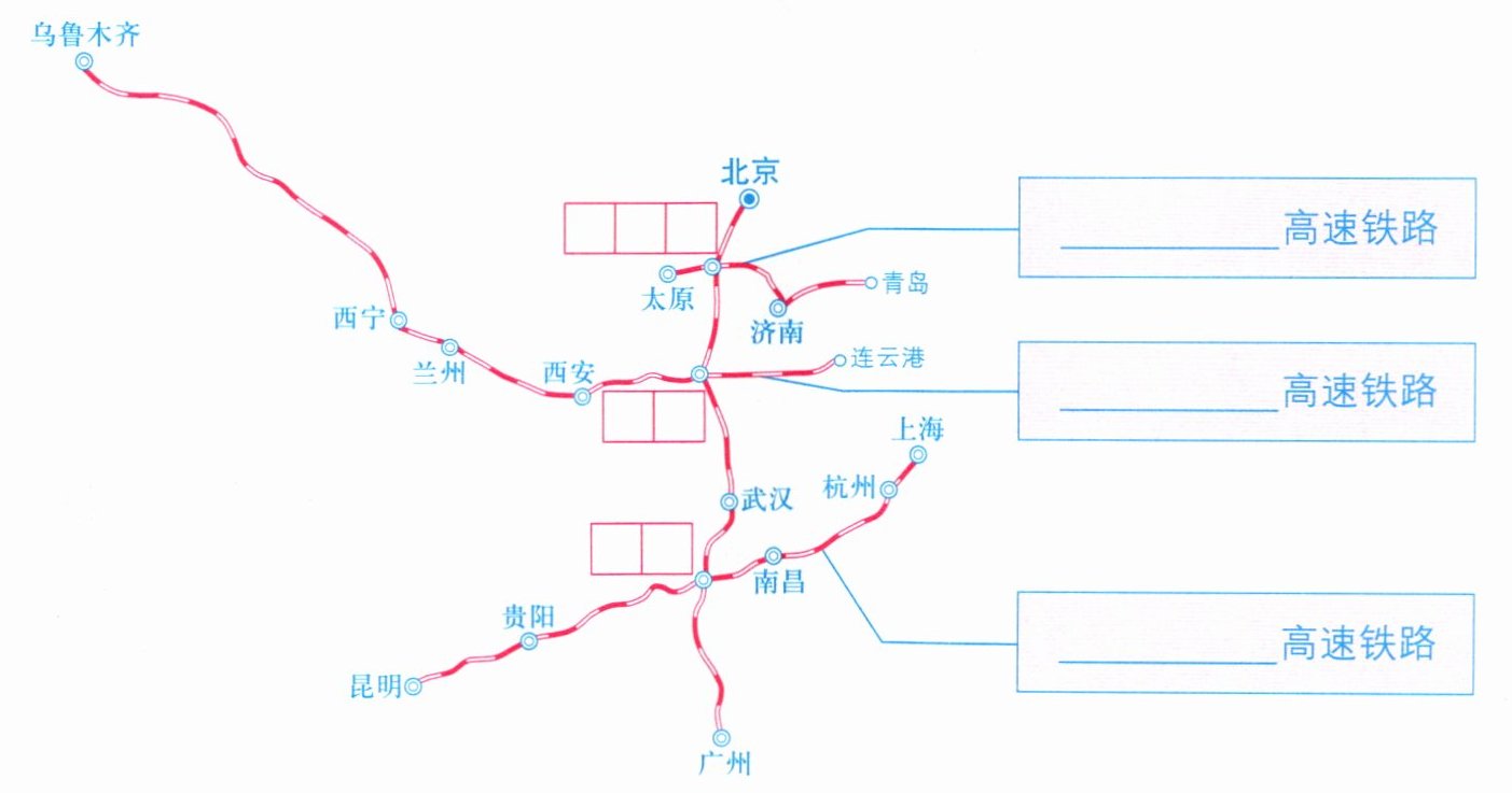 3. 填出下列三条与京广高速铁路相交的东西向的高速铁路线路和途径的铁路枢纽的名称。