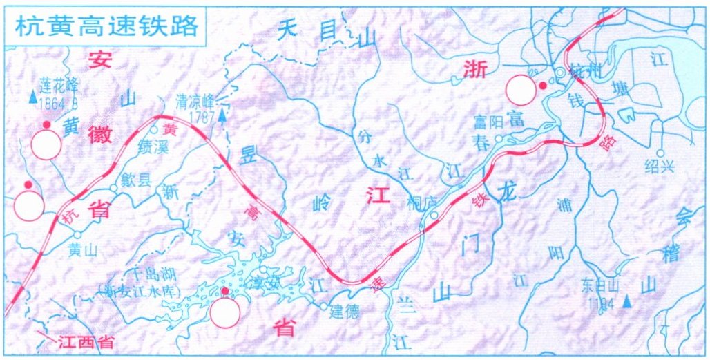 4. 杭黄高速铁路东起杭州,西至黄山,跨越____、____两省。地形以____、丘陵为主。杭黄高速铁路沿线河流众多,属于钱塘江水系,其干流自西向东分别称为____江、____湖、富春江、____江。