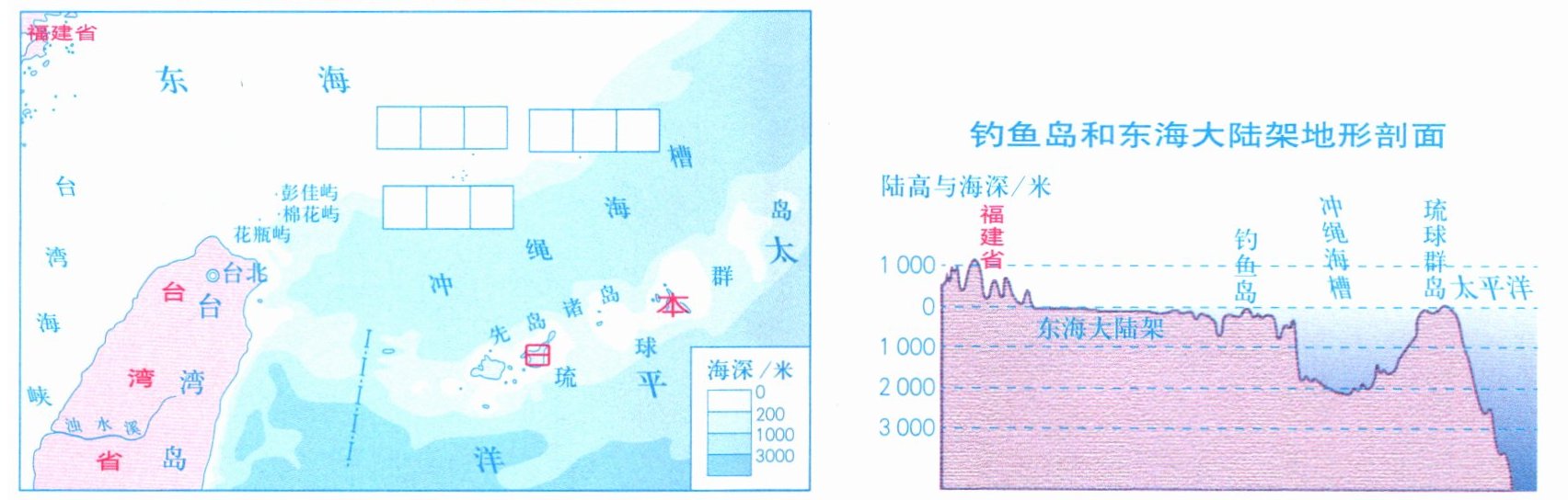 8. 在上图中相应位置填注:钓鱼岛、黄尾屿、赤尾屿。