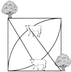 如图,一块边长为 $ 10 \, m $ 的正方形草地,在相对的一对顶点上各有一棵树,树上各拴着一头牛,绳长都是 $ 10 \, m $,两头牛都能吃到的草地面积是多少平方米?