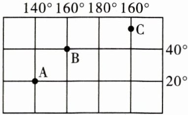 (1) 图中A点的经纬度为______,B点的经纬度为______,C点的经纬度为______。