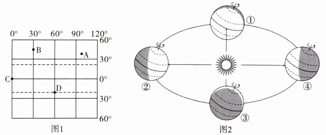 (6)“夸父一号”综合性太阳探测卫星发射后的74天左右,太阳直射在图1中的D点,此时地球运动到图2中的______(填数码)位置,此时北半球的节气是______。