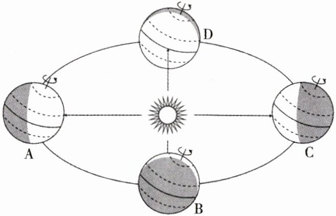 (3)当地球公转到A点时,太阳直射的纬线是______;当地球公转到C点时,太阳直射的纬线是______;当地球公转到B、D点时,太阳直射的纬线是______。