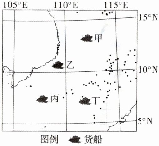 2023 年 3 月 3 日,在南海海域($7^{\circ}N,108^{\circ}E$)有一艘外国货船急需救援。接到求救信息后,我国救援船即刻前往救助。下图示意该货船失事地点附近海域,据此完成 3、4 题。