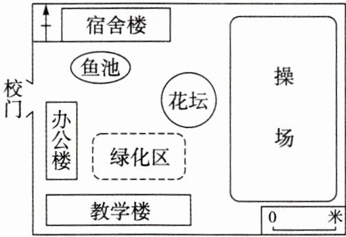 下图是小华绘制的学校平面图,但老师发现图中基本信息不够全面,需要补充完善。据此完成 5、6 题。