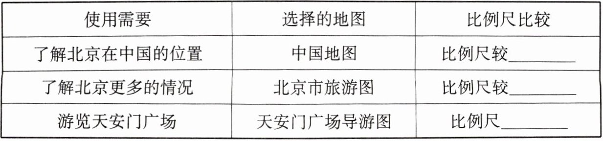 2. 地图的比例尺有大有小。相同图幅的地图,比例尺越大,表示的范围越______、内容越______;比例尺越小,表示的范围越______、内容越______。我们应该根据需要选择比例尺合适的地图。