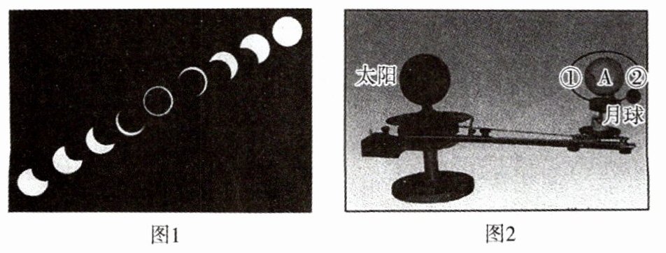 9. 月食是指当地球运行到月球和太阳中间时,此时三大天体恰好或几乎处于同一条直线上,太阳投射到月球表面的光正好被地球挡住,从而导致月球上出现黑影的现象。读月食景观图(图1)和三球仪装置图(图2),回答下列问题。