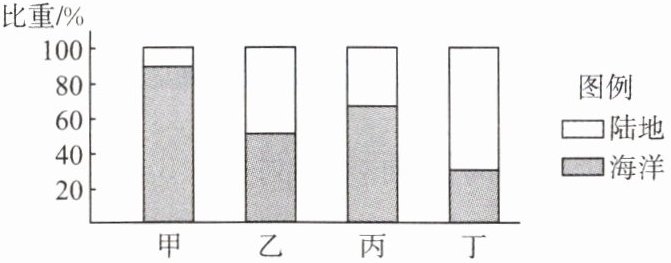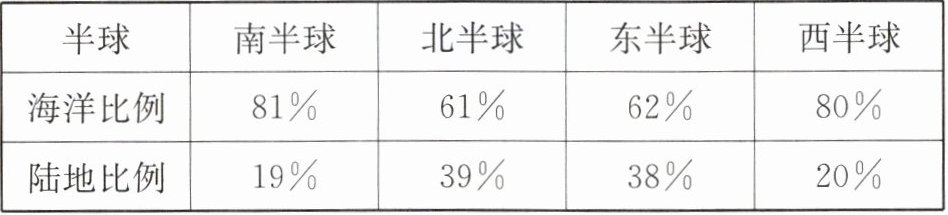读海洋与陆地在南、北、东、西半球所占比例表,完成1、2题。