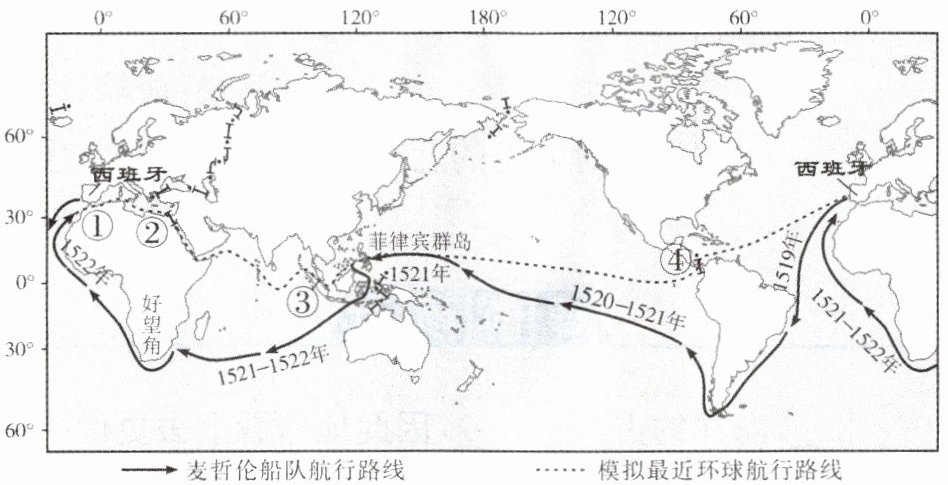 1519年,麦哲伦率领船队从西班牙出发开始人类首次环球航行,1522年9月船队返回西班牙。读图,完成3、4题。