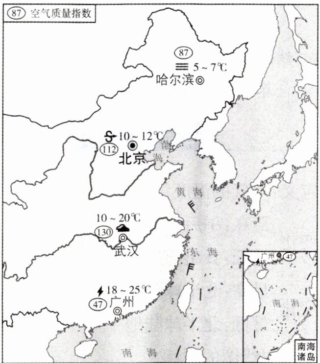 (4)图中四个城市中,气温日较差:哈尔滨的是(7-5)=2 ℃,北京的是(12-10)=2 ℃,武汉的是(20-10)=10 ℃,广州的是(25-18)=7 ℃,气温日较差最大的是武汉;空气指数分别是:哈尔滨87、北京112、武汉130、广州47,空气指数越低,空气质量越好,空气质量最好的是广州;北京出现的这种灾害性天气会增大空气质量指数,使空气质量级别降低。