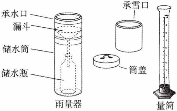 在气象观测站,人们使用______和______测量降水量。测量降水量是将雨量器中储水瓶所接到的全部雨水倒入量筒中,根据量筒上的______,确定降水量是多少毫米。如果是降雪和冰雹,则需将它们______之后再测量。