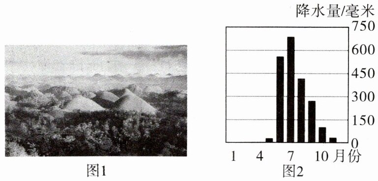 菲律宾薄荷岛中部丘陵上的草在雨季时为绿色,旱季则被炎热的太阳晒干变成咖啡色,酷似巧克力,因此得名“巧克力山”(图1)。图2示意薄荷岛降水量柱状图,据此完成7、8题。