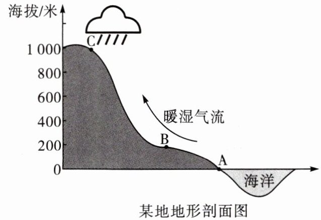 (3)⑦地是青藏高原地区,夏季气候比东部同纬度的长江中下游平原低很多。气象工作者在上图B处(200米)测得的气温是14.8℃,则C处的气温约是____℃;降水也有很大差异,迎风坡降水____。