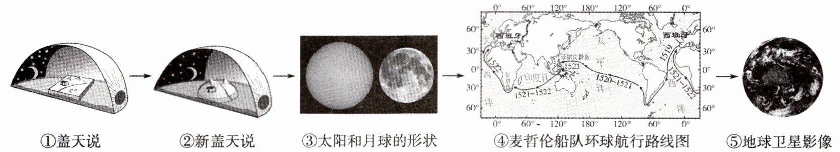 中国古代盖天说(大地是______,天空像一个盖子)→新盖天说(天地相盖,二者都是______形)→汉代张衡鸡蛋说(宇宙像鸡蛋,天地都是圆球形,______独居其中)→古希腊亚里士多德根据______时地球影子是圆的,推断地球是______→______船队环球航行证明地球是球形→人造地球卫星拍摄的照片说明地球是一个______。
