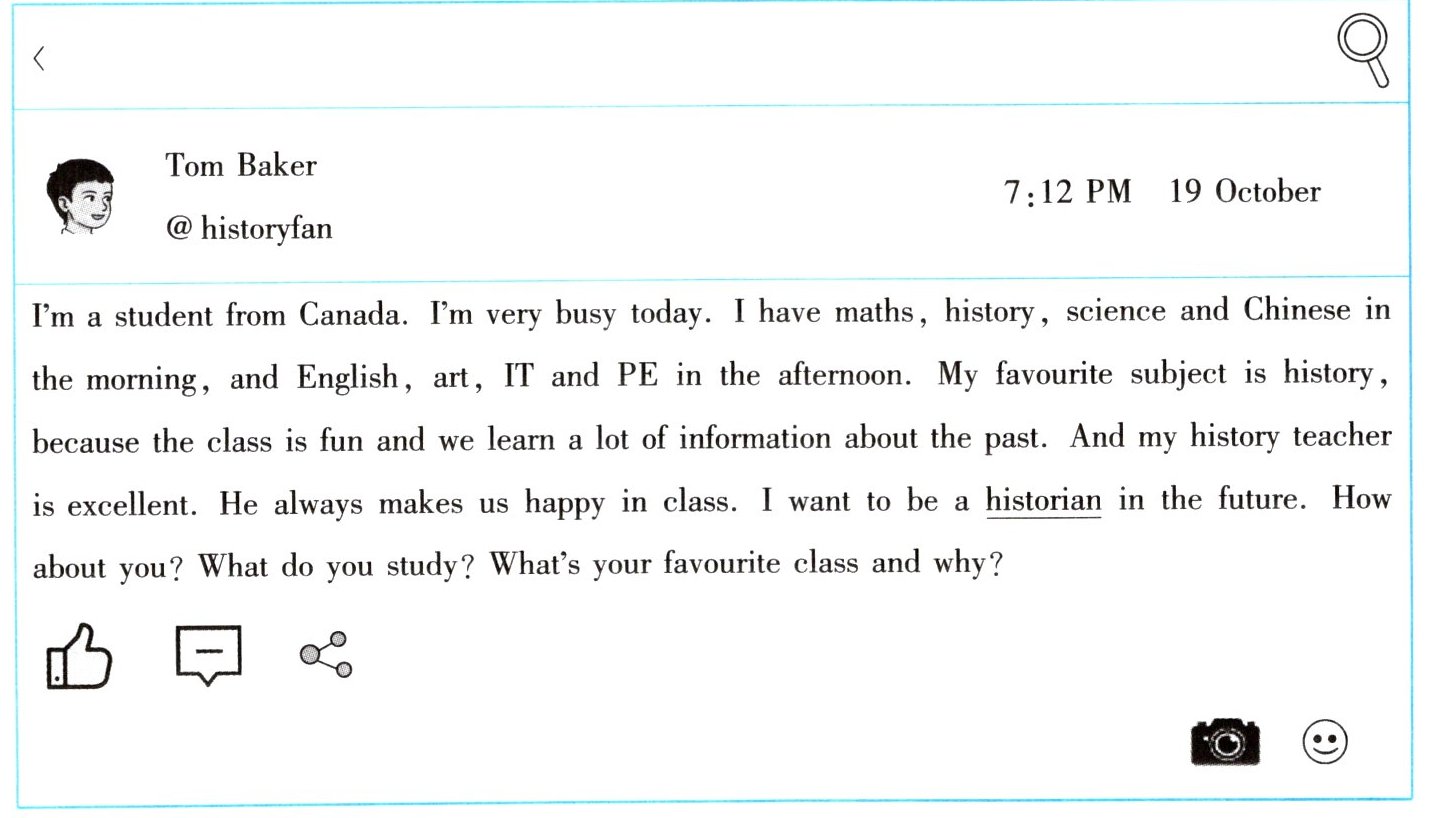I'm a student from Canada. I'm very busy today. I have maths, history, science and Chinese in the morning, and English, art, IT and PE in the afternoon. My favourite subject is history, because the class is fun and we learn a lot of information about the past. And my history teacher is excellent. He always makes us happy in class. I want to be a historian in the future. How about you? What do you study? What's your favourite class and why?