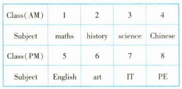 2. D 3. A 4. I have Chinese, maths, English, science, history, music and art. My favourite subject is music because I want to be a singer in the future. (答案不唯一,仅供参考)