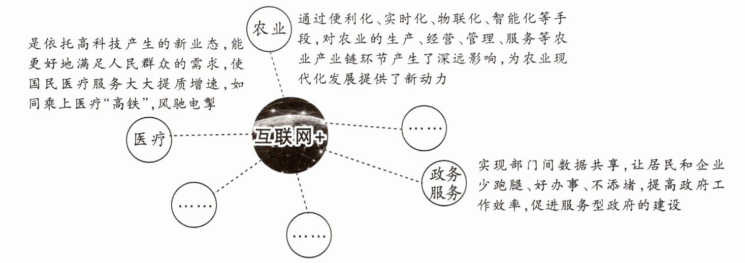 11. “互联网+”是在知识社会创新2.0推动下,由互联网形态演进、催生的经济社会发展新形态。“互联网+”通过自身的优势,对传统发展模式进行优化升级,使其更适应当下的新发展,从而推动社会不断向前发展。阅读下图内容,回答问题。(6分)