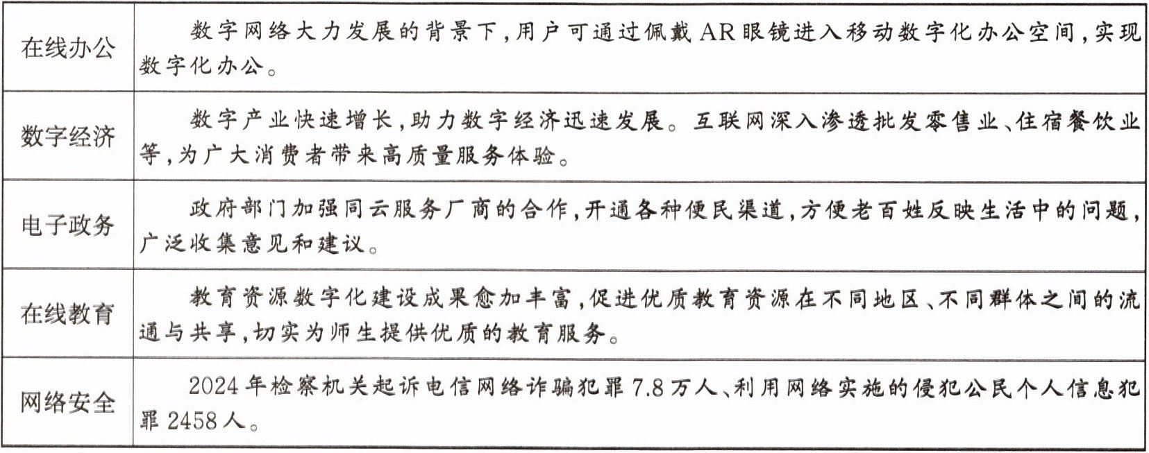 12.调查结果与分析:①在数字网络大力发展的背景下,用户可通过AR眼镜进入聊天、会议、文档等多种办公场景,网络深刻改变着我们的生活方式,让我们的生活变得更加丰富、便利和美好。②互联网深入渗透批发零售等行业,为广大消费者带来高质量服务体验,推动了生产方式的深刻变革,推动传统行业转型升级,提升了经济发展水平。③政府部门加强同云服务厂商的合作,开通各种便民渠道,改进了社会治理方式,有助于完善线上线下一体的智能化、精细化公共服务,提高社会治理水平/畅通人们参与社会治理的渠道,保障人们的知情权、参与权、表达权和监督权,促进民主政治的进步。④教育资源数字化促进优质教育资源在不同地区、不同群体之间的流通与共享,推动信息互联互通,促进教育公平。⑤网络存在网络诈骗、个人信息泄露等安全问题,我们在享受网络带来的便利的同时,也要全面认识网络,了解其可能衍生的社会问题。