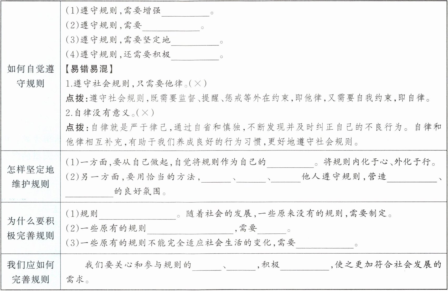 |如何自觉遵守规则|(1)遵守规则,需要增强______。(2)遵守规则,需要______。(3)遵守规则,需要坚定地______。(4)遵守规则,还需要积极______。【易错易混】1.遵守社会规则,只需要他律。(×)点拨:遵守社会规则,既需要监督、提醒、惩戒等外在约束,即他律,又需要自我约束,即自律。2.自律没有意义。(×)点拨:自律就是严于律己,通过自省和慎独,不断发现并及时纠正自己的不良行为。自律和他律相互补充,有助于我们养成良好的行为习惯,更好地遵守社会规则。|