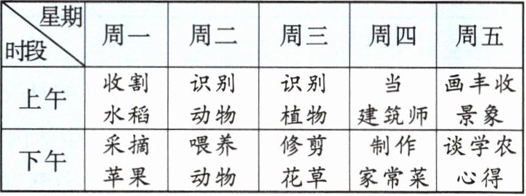 |下午|采摘苹果|喂养动物|修剪花草|制作家常菜|谈学农心得|