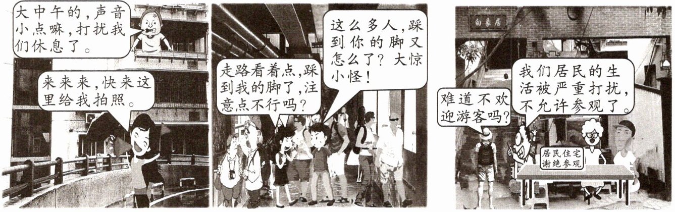 11. 启航原创 因为优越的观景位置和独特的建筑结构,位于重庆市渝中区的白象居成为“网红打卡点”。随着大量游客聚集,小区公共通道被占用等问题的出现,居民生活也被打扰……请你阅读下列漫画,运用相关知识,回答问题。(6分)