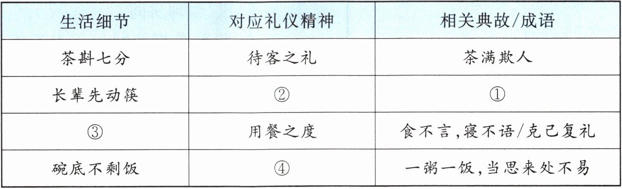 ①长幼有序/孝悌之道 ②尊卑有序 ③不用筷子敲碗、不越界夹菜 ④节俭之德(一空1分)